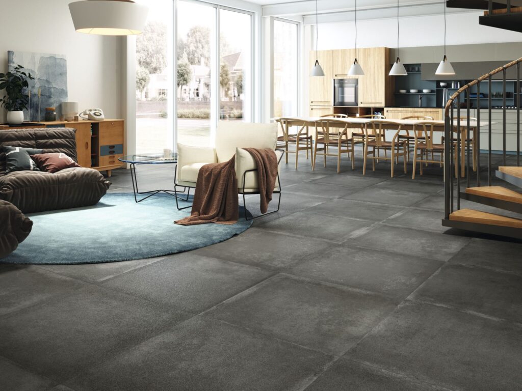 Onderhoudsvriendelijke keramische beton look tegel , kan in elke stijl van woning . Zowel vloer als wand voor alle ruimtes binnen in huis .