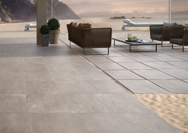 Stijlvolle keramische terras tegel die de look geeft van een beton . Perfect voor en strak tot landelijke en moderne stijl .